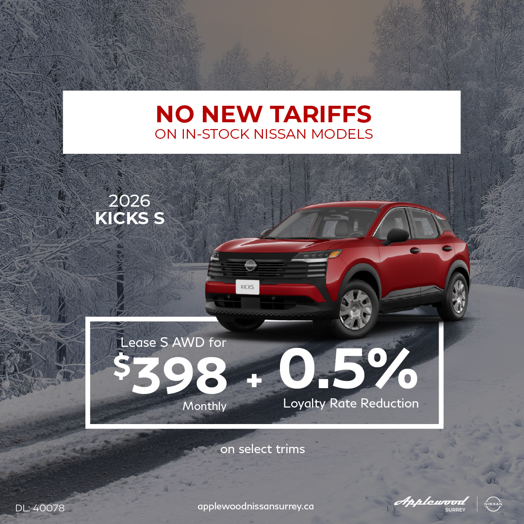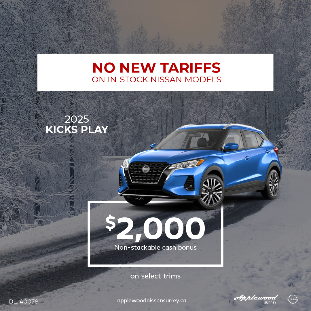 Offers available from January 3, 2026 to February 2, 2026. *Representative finance offer based on a new 2025 KICKS PLAY S. Selling Price is $ 23,866 financed at 3.99 % APR equals 84 monthly payments of $ 326 monthly for a 84 month term. $ 1595 down payment is required. Cost of borrowing is $ 3,527 for a total obligation of $ 28,958. Financing Bonus of $ 0 is available on advertised offers for 2025 KICKS PLAY S. 0.5% Loyalty Rate Reduction applies to new and previously unregistered 2025 KICKS PLAY models that are purchased or leased/financed (on approved credit) from an authorized Nissan dealer in Canada between January 3, 2026, and February 2, 2026. Offer subject to change or cancellation without notice.License, registration, insurance and applicable taxes are extra. Offers are available on approved credit through Nissan Canada Finance for a limited time, May change without notice. Retailers are free to set individual prices. Vehicles and accessories are for illustration purposes only.
