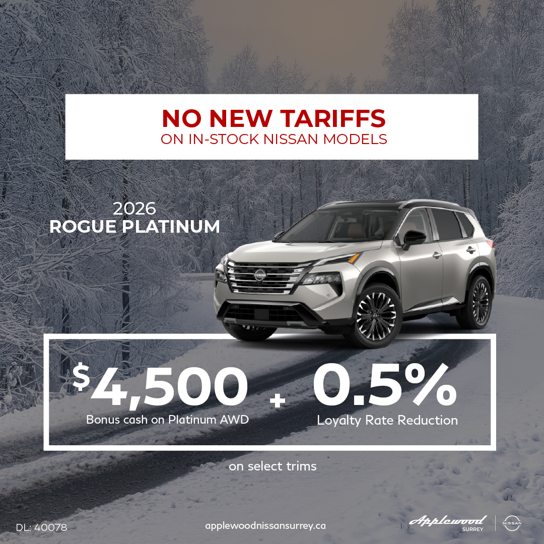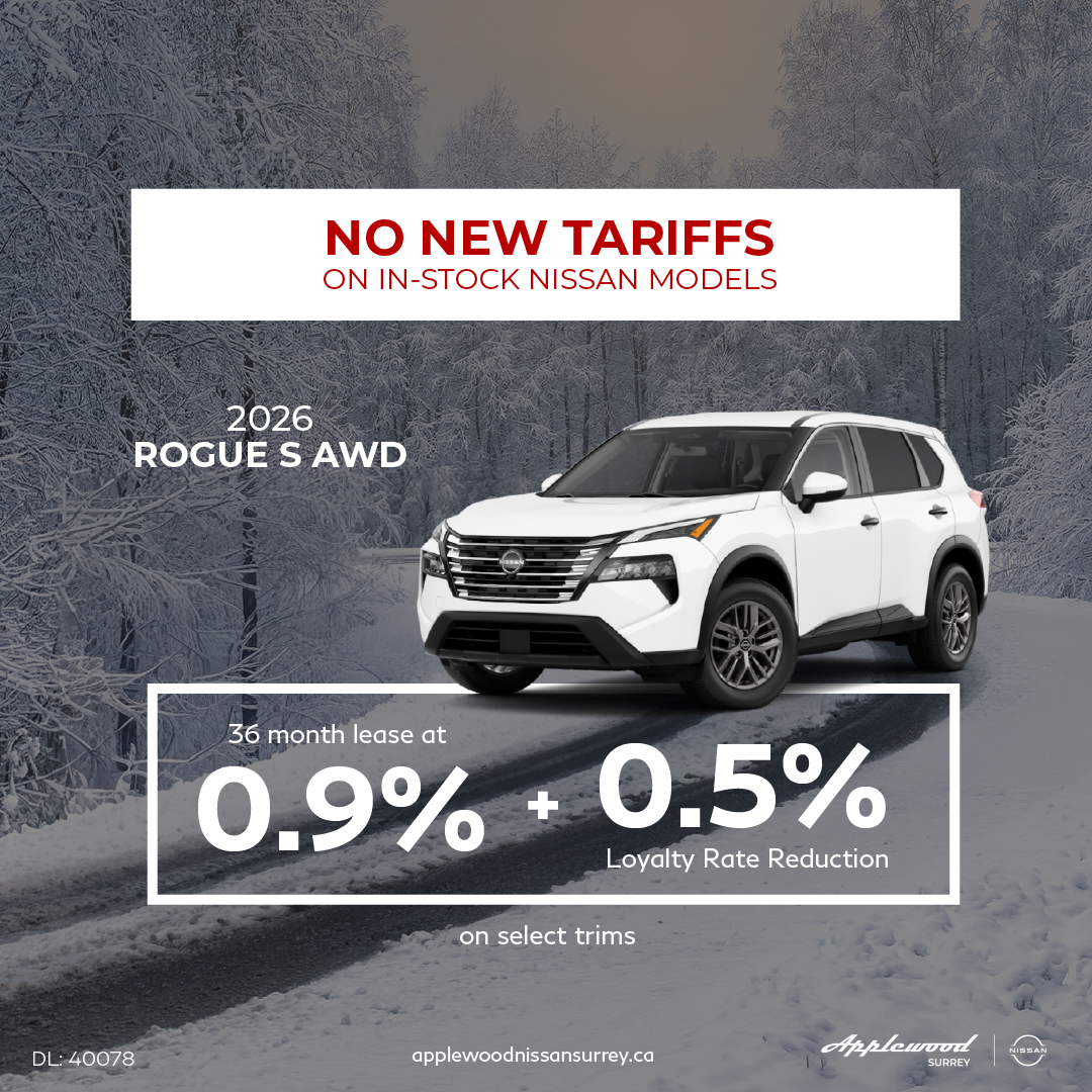 Offers available from January 3, 2026 to February 2, 2026. Payments cannot be made on a weekly basis, for advertising purposes only.*Representative monthly lease offer based on a new 2026 Rogue S at 0.9% APR for 36 months equals monthly payments of $ 468 with $ 0 down payment, and $0 security deposit. Lease based on a maximum of 16,000 km/year with excess charged at $0.10/km. Total lease obligation is $ 16,911. Lease Bonus of $ 0 is included in the advertised offer.Offers available from January 3, 2026 to February 2, 2026. *Representative finance offer based on a new 2026 Rogue S. Selling Price is $ 37,242 financed at 0.9 % APR equals 36 monthly payments of $ 468 monthly for a 36 month term. $ 0 down payment is required. Cost of borrowing is $ 0 for a total obligation of $ 16,911. Financing Bonus of $ 0 is available on advertised offers for 2026 Rogue S.License, registration, insurance and applicable taxes are extra. Offers are available on approved credit through Nissan Canada Finance for a limited time, May change without notice. Retailers are free to set individual prices. Vehicles and accessories are for illustration purposes only.