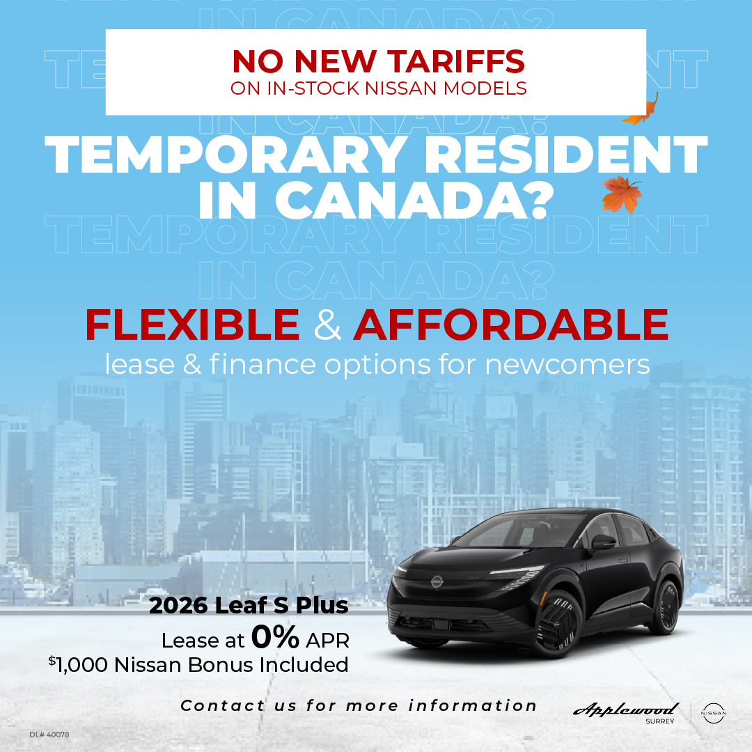 Whether you’re a temporary resident or recent arrival to Canada, Nissan has options to help get you behind the wheel of your next vehicle. Contact Applewood Nissan for more information.